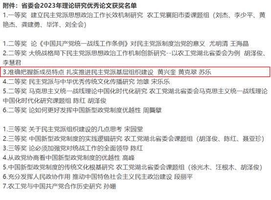 近日,农工党中央印发了《关于2024年理论研究优秀论文评审结果的通报》,农工党学院支部主委、球友会QY千亿入口教授黄兴奎撰写的理论文章《准确把握新成员特点 扎实推进民主党派基层组织建设》获二等奖。